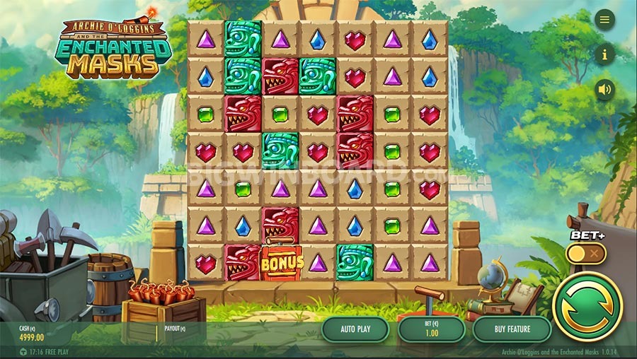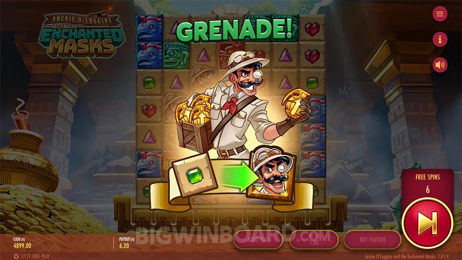 The grenade wild is one of the key features of Archie O’Loggins and the Enchanted Masks. Triggered by the grenade wild, this feature stays in place and activates either when part of a winning cluster or when no further actions occur. The grenade wild upgrades one or two low-paying symbols to medium or high-paying symbols, increasing the chances of hitting a bigger win. This feature adds an exciting twist to the gameplay, especially when combined with the cluster pays mechanic, enhancing the overall experience.