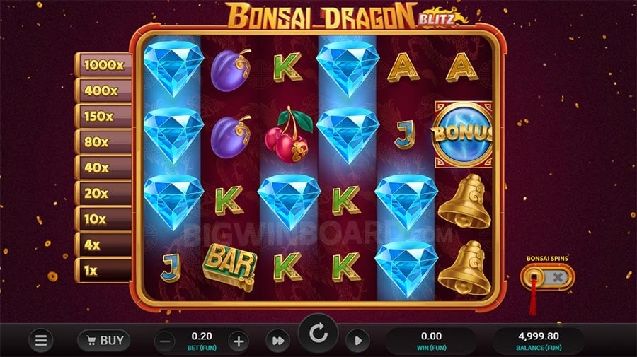 Bonsai Dragon Blitz Dream Drop uses a 6×4 grid layout with a 4,096 ways to win payline system. This large number of ways to win means that players can enjoy more opportunities for regular wins, even if they aren’t hitting the jackpot. The game’s symbols are a blend of low and high pay, with the Ten to Ace card ranks being the low-paying symbols, and plums, cherries, bars, bells, and diamonds offering higher payouts. The Dragon symbols and scatters are particularly important, as they trigger significant features, including the Collect and Bonsai Spins features.