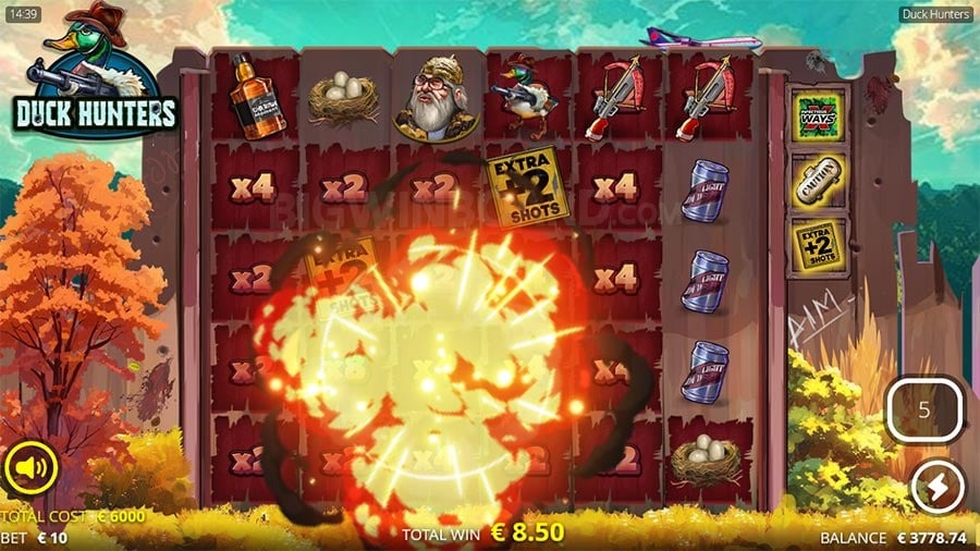 Triggering 3 scatter symbols activates 7 Duck Hunt Spins, where position multipliers remain active throughout the round. If you’re lucky, the +1 Shot symbol will add an extra spin. During this round, you can receive various upgrades, such as upgraded xWays or upgraded Bombs. These features spice up the gameplay, giving players even more chances to hit it big.