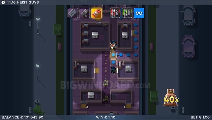 Triggering the bonus with three scatters transports you to a video-game style map. The three Heist Guys move as a unit along colored arrows toward the vault. Rooms dotted along the paths contain safes that award coins, keycards, zapper charges, or even direct Max Win prizes. The immersive map sequence is where the slot truly shines.