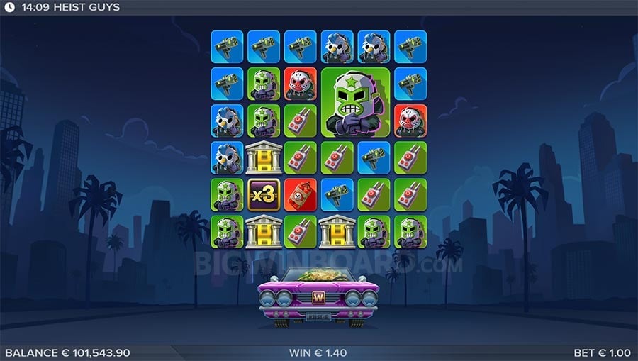 Heist Guys uses a 6×6 cluster-pay grid: any cluster of five or more matching symbols counts as a win. Beyond the standard 1×1 icons, you’ll also encounter super 2×2 and mega 3×3 symbols. Big symbols count for multiple positions, and any empty spaces beneath them fill with duplicates of the same icon, keeping the action rolling.