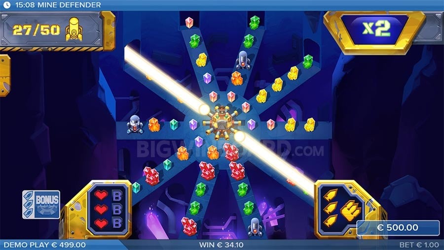 If Mine Defender is, broadly speaking, a mining-themed game, it is not the sort of slot that sees gamblers traipsing down mine shafts to meet a bearded, overall-wearing prospector as is usually the case. Instead, players step underneath ‘the wreckage of a broken world’ where man and machine do battle with enemy robots. These aren’t just empty words, either. The dude you can see at the bottom of the screen literally shoots at enemies when they start invading the screen, as well as their leaders in boss battles with potentially sizable amounts of dough on the line. Complementing the pixelated qualities in the artwork is a mesmerizing synthwave soundtrack, which, when combined, may awaken memories of an earlier age of gaming.