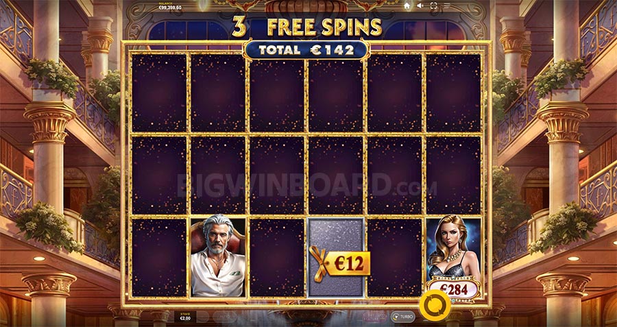 Landing three or more scatter symbols on reels 2 to 5 triggers the Free Spins feature, awarding 10 free spins. The bonus round is played on a 6×3 grid for 3 scatters or a 6×4 grid for 4 scatters. During free spins, only blank, Price Tag, Glamour Girl, and Trillionaire symbols can land. When Price Tag symbols appear, they remain on the reels until the bonus ends, unless collected by the Glamour Girl symbol. If two or more Glamour Girls land, they each collect the Price Tag values separately. When a Trillionaire symbol lands, it doubles the value of Price Tag and Glamour Girl symbols on the grid, boosting the potential for even larger wins.